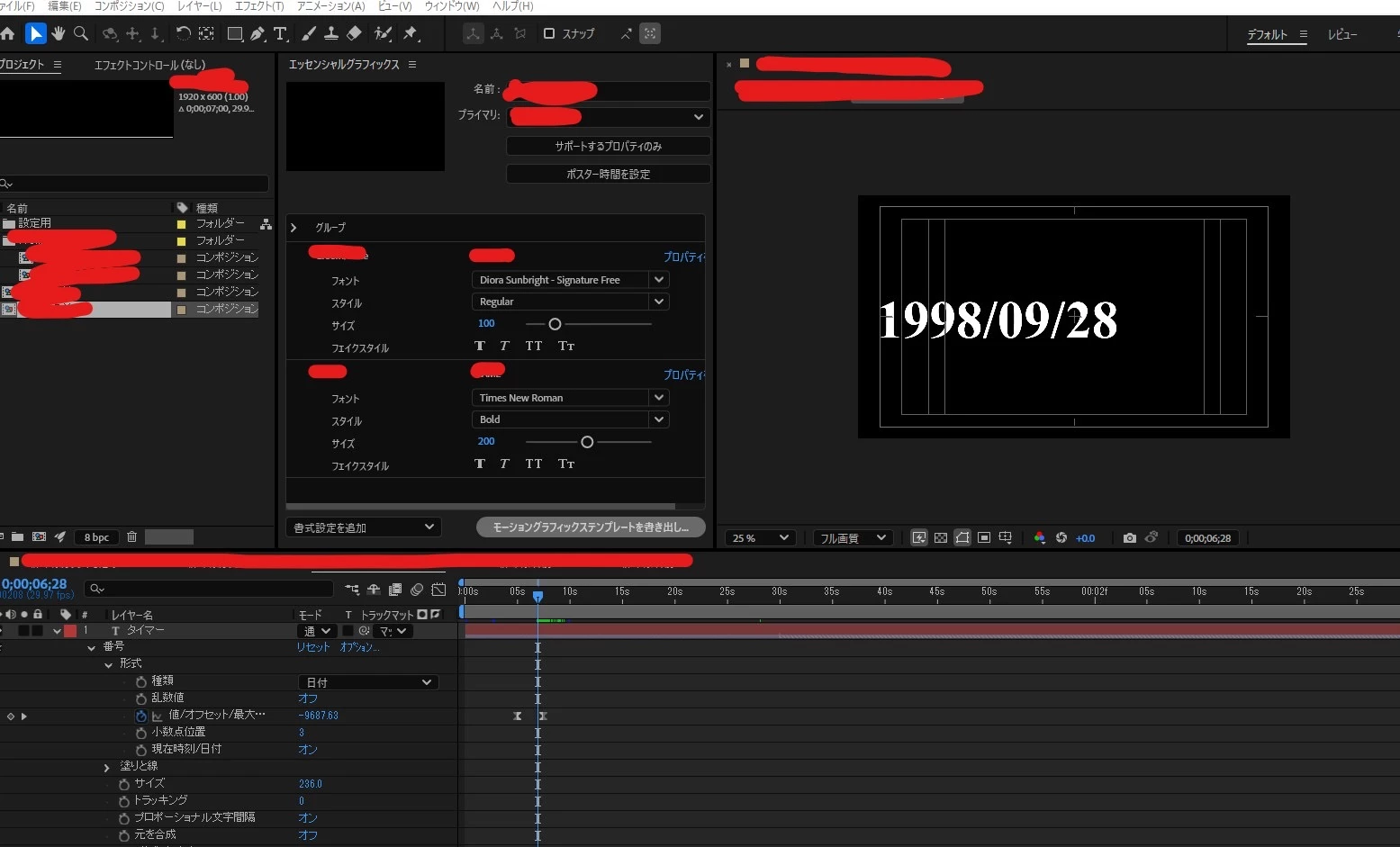 ②キーフレームで今日の日付から指定した日付にカウントダウンするものを作ったのですがエッセンシャルグラフィックスにするとキーフレームが削除されてしまいカウントが動かない