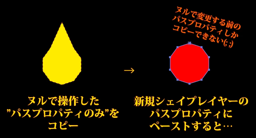 ただこの方法では、「ヌルで操作後のパスプロパティのみ」を「他のシェイプレイヤーのパスプロパティ」にコピペして使うことができないところが少し歯がゆいなと思うのですが、よい方法などはございませんでしょうか。(下図参照)