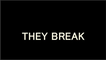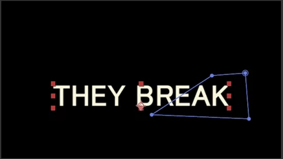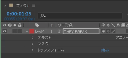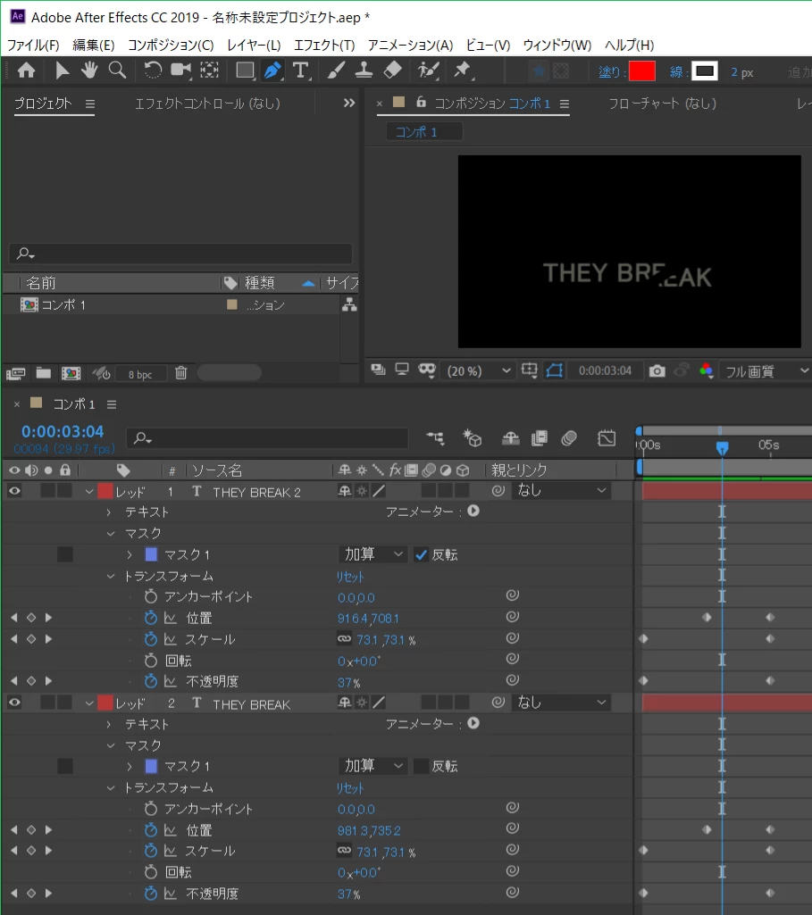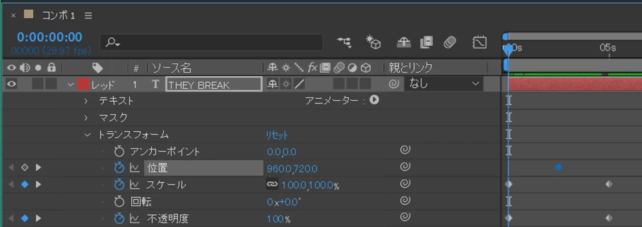 ③「THEY BREAK」の文字が現れてから消える迄のキーフレームを、「スケール」と「不透明度」パラメーターに打ちます。また、「位置」パラメーターに文字が分かれ始める時のキーフレームを打ちます。