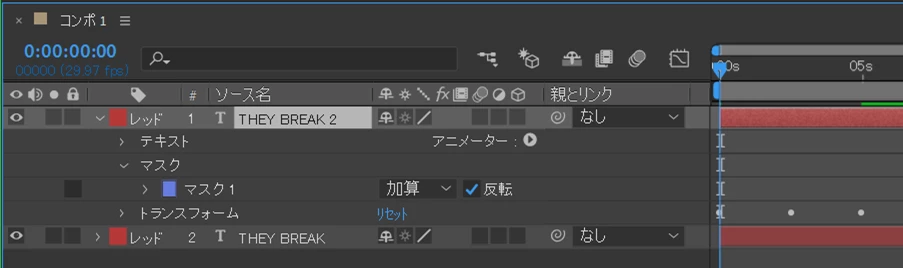 ⑤複製テキストレイヤーを展開し、「マスク 1」の「反転」にチェックを入れます。