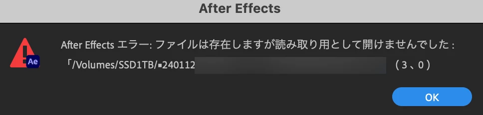 After Effects 2024 エラー 「ファイルは存在しますが読み取り専用として開けませんでした」対処法