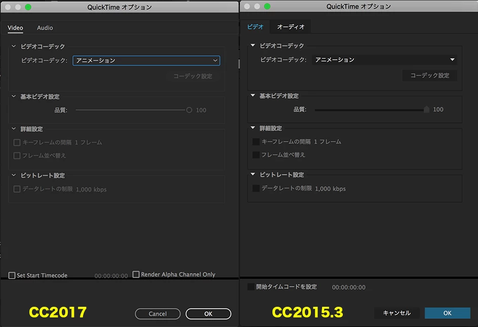 CC2015のレンダリング設定と比較すると、QuickTImeオプションで日本語化が不完全な状態になっていました。