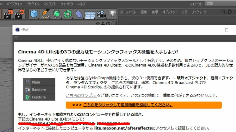 CINEMA 4D Liteのヘルプ→登録→追加認証ボタンをクリックしてもスクリプトエラーが表示されMAXSONのサイトが開くだけでどこで認証するのかも解りません。何か方法があるのでしょうか?ご教授ください。