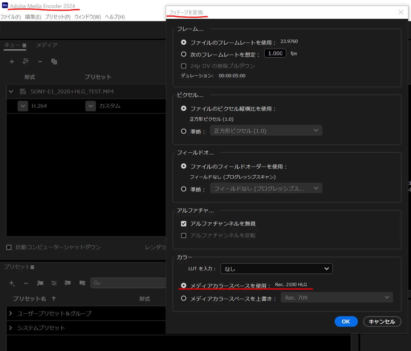 を確認しても、Rec.2100 HLGだけで様々な種類がありどれを選んでも元動画の色味は再現できませんでした。