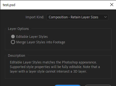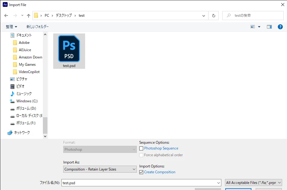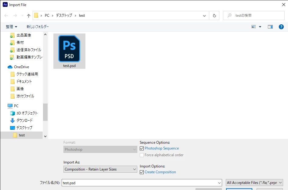 この方法ですと1フレームのコンポジションとなる、同フォルダ内の他のPSDの影響を受けるなど、扱いづらいコンポジションが出来上がってしまうことになります。