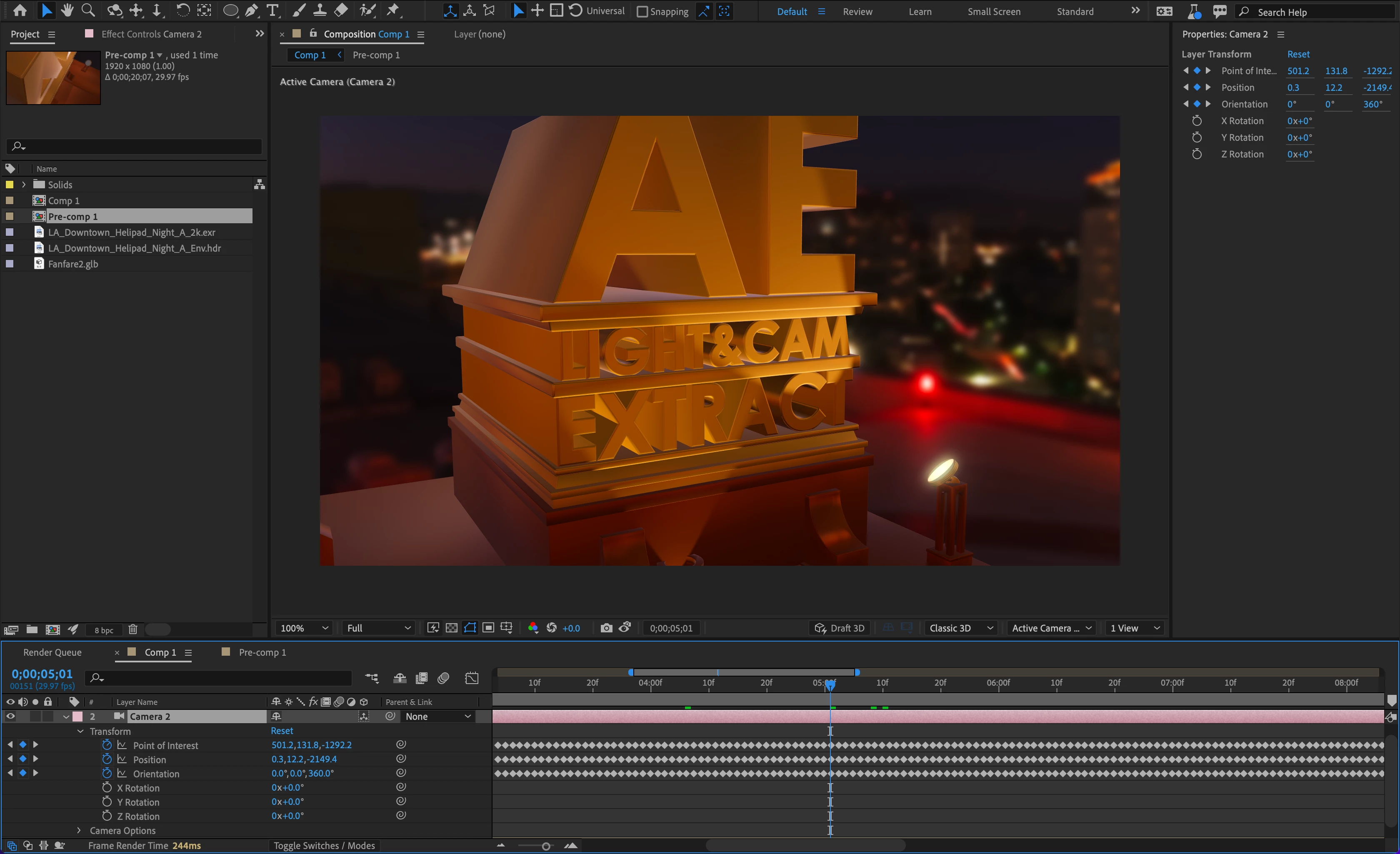The goal with extracting cameras and lights is so that if you have spent the time to set up a scene in your 3D modeling app, you can quickly recreate the same scene in After Effects.