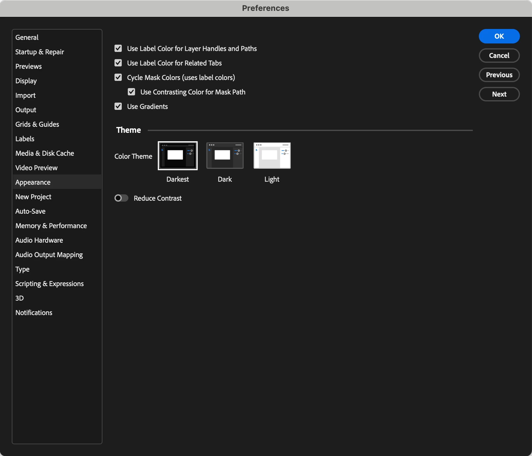 After Effects Beta now ships with three different themes: Darkest, Dark and Light. There’s also a new toggle for switching between a high-contrast mode for easier visibility and accessibility or a low-contrast mode for focusing on your content.
