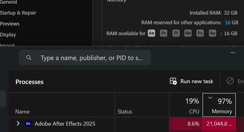 Furthermore, even when i go to edit clear memory and disk cache, there's nothing to clear as i havent launched a preview, i've only just opened my comp in AE and havent started a preview (i also have disabled "cache frames when idle").