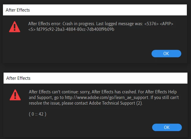 I require assistance with an issue that occurs when launching the program. It crashes and displays the error messages shown in the screenshot. What's strange is that this issue only arises when I run the program from its desktop shortcut. However, I can continue to use After Effects if I initiate it through a project file (.aep) and create new projects by selecting 'File > New Project' from there. I can still use After Effects, but the inconvenience of having to start it in this manner is quite frustrating.