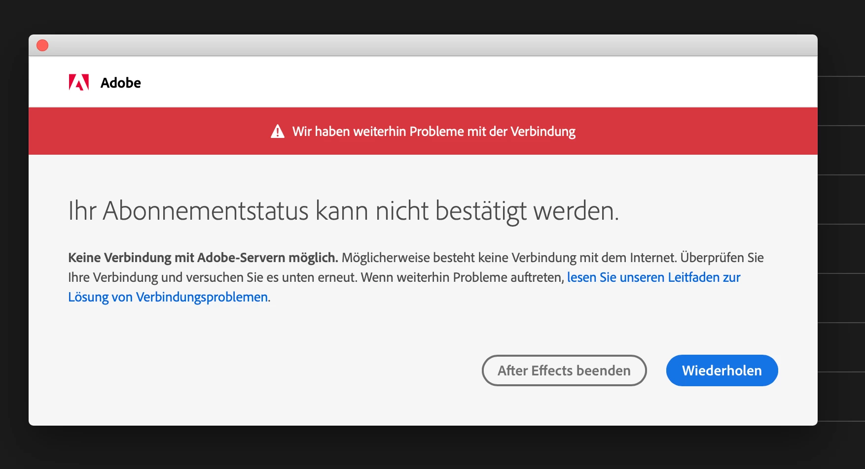 Hello, since yesterday AE and PR can no longer connect to check the status of the subscription. The CC app works fine. I cheked keychain and certificates, reinstalled everything, nothing helped. What could that be? Thanks!