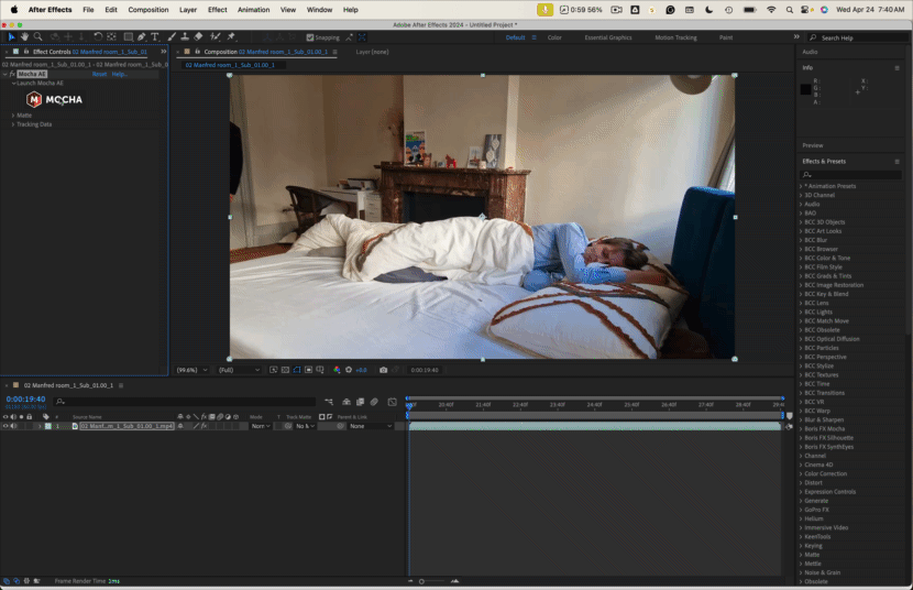 I have this scene, the camera moves slightly (no tripod) and there's a little panning when another character enters the room. I'd like to add a poster on the wall (which is quite white with no reference points) or above the heather, if it's easier. And the poster should move accordingly to the camera. I can't seem to use the camera track (not enough points, even with detailed analysis checked). I also can't really stabilize the scene because there is a bit of 3D distortion and no two clear points.