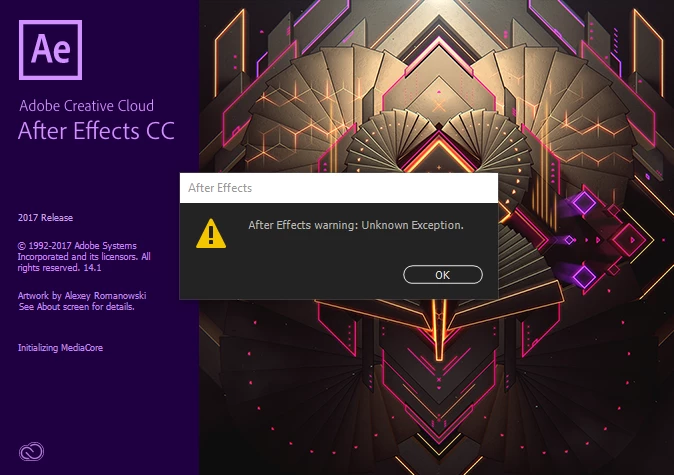 I'm having trouble launching AE. I get a dialogue box that says "After Effects warning: Unknown Exception." This pops up twice with the launch screen and then a box that says "After Effects can't continue: unexpected failure during application startup" appears (pictures below).