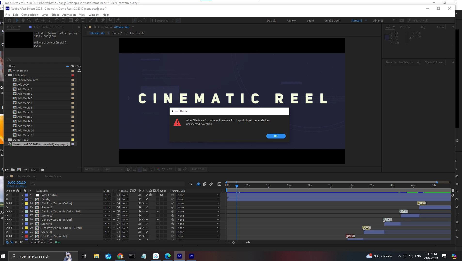 After Effect Can't Continue: Premier Pro Import Plugin generated an unexpected exception