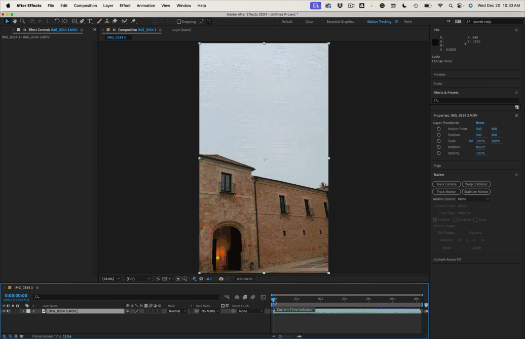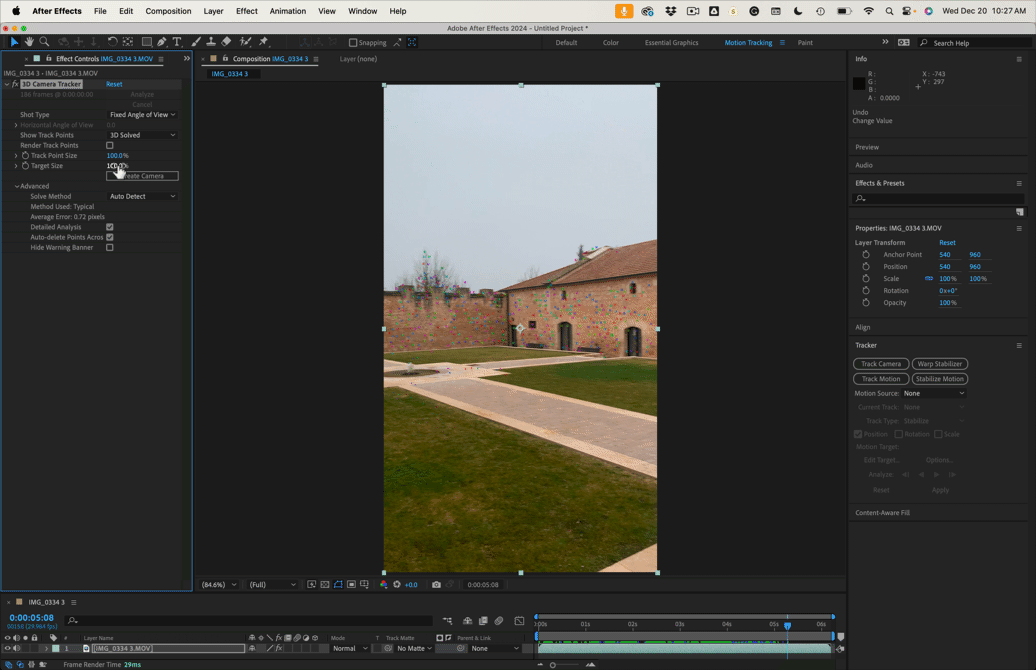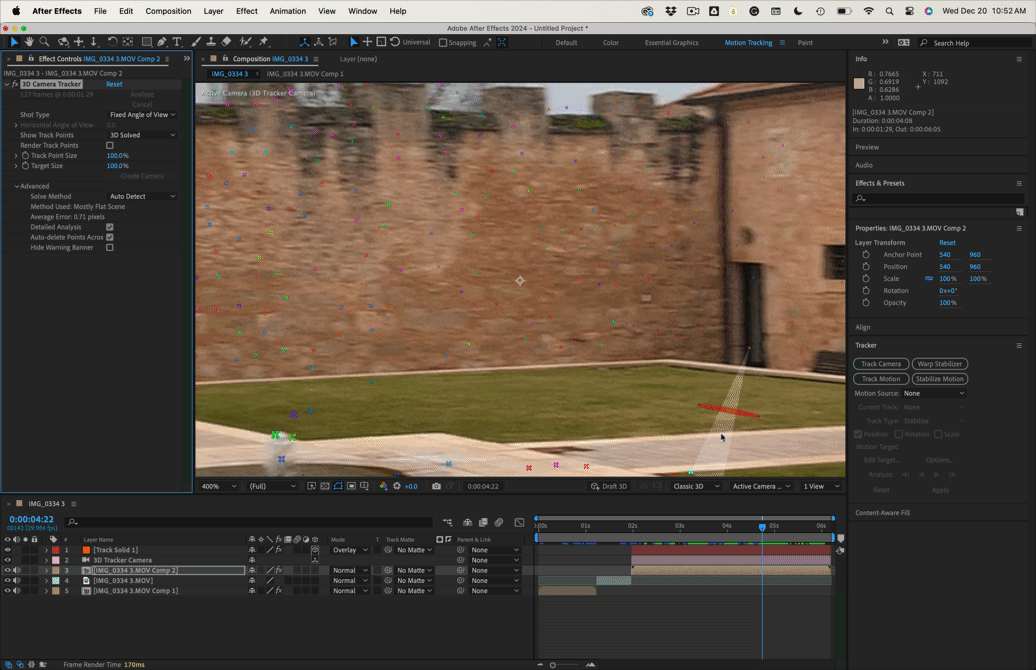 When doing Camera Tracking, it is always a good idea to split up the shot so you only track the frames where you want to add some 3D elements to the scene. You can split the layer using Shift + Ctrl/Cmnd + d. I usually pre-compose the cuts, moving all attributes and trimming to layer length. Here, I tried splitting the shot into three sections.