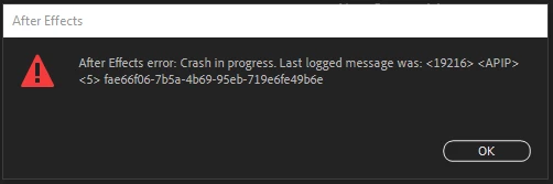 First: After Effects error: Crash in progress. Last logged message was: <19216> <APIP> <5> fae66f06-7b5a-4b69-95eb-719e6fe49b6e