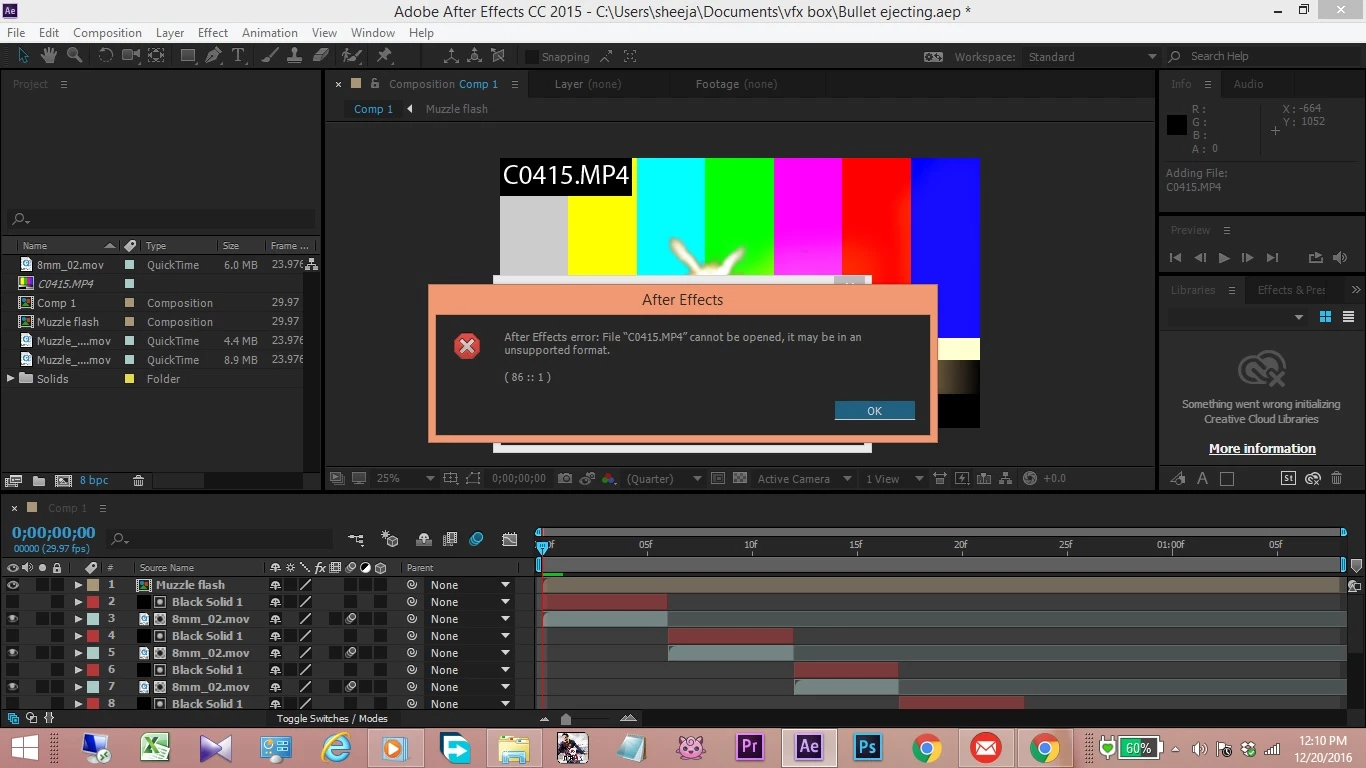 After effects Error Filename.mp4 unsupported format 86::1