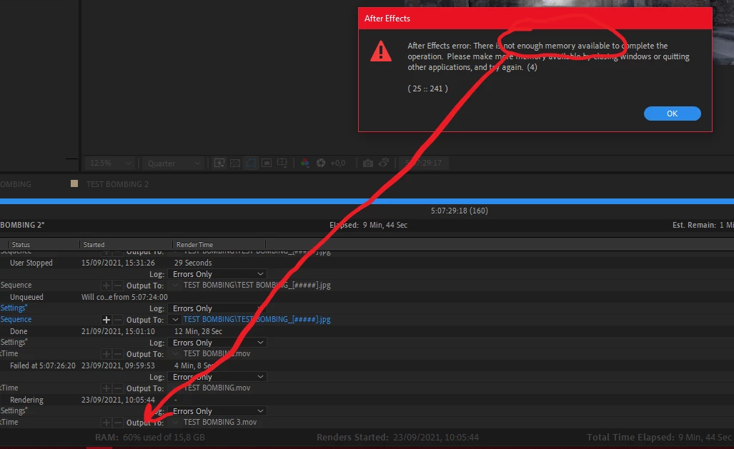 You should not go into preferences and just allocate all available ram to Adobe. Adobe likes even numbers of GB and so do the other apps. Pick 2 or 4 GB for other apps first and see if that solves the problem. It is completely possible to run out of system resources when rendering, especially if you have motion blur/ lights and shadows, or any kind of time-bending. The reported ram usage is just an average estimate. Come upon a frame that requires more ram than is available and AE will hand up and report the problem before the calculations of ram usage are displayed.