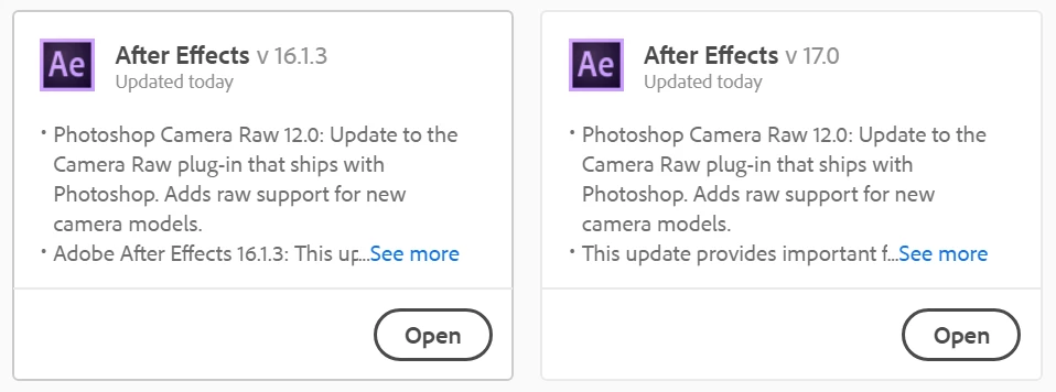 So I just updated my Adobe apps from the Creative Cloud App and I just noticed that there are two versions of Ae listed, v 16.1.3 and v 17.