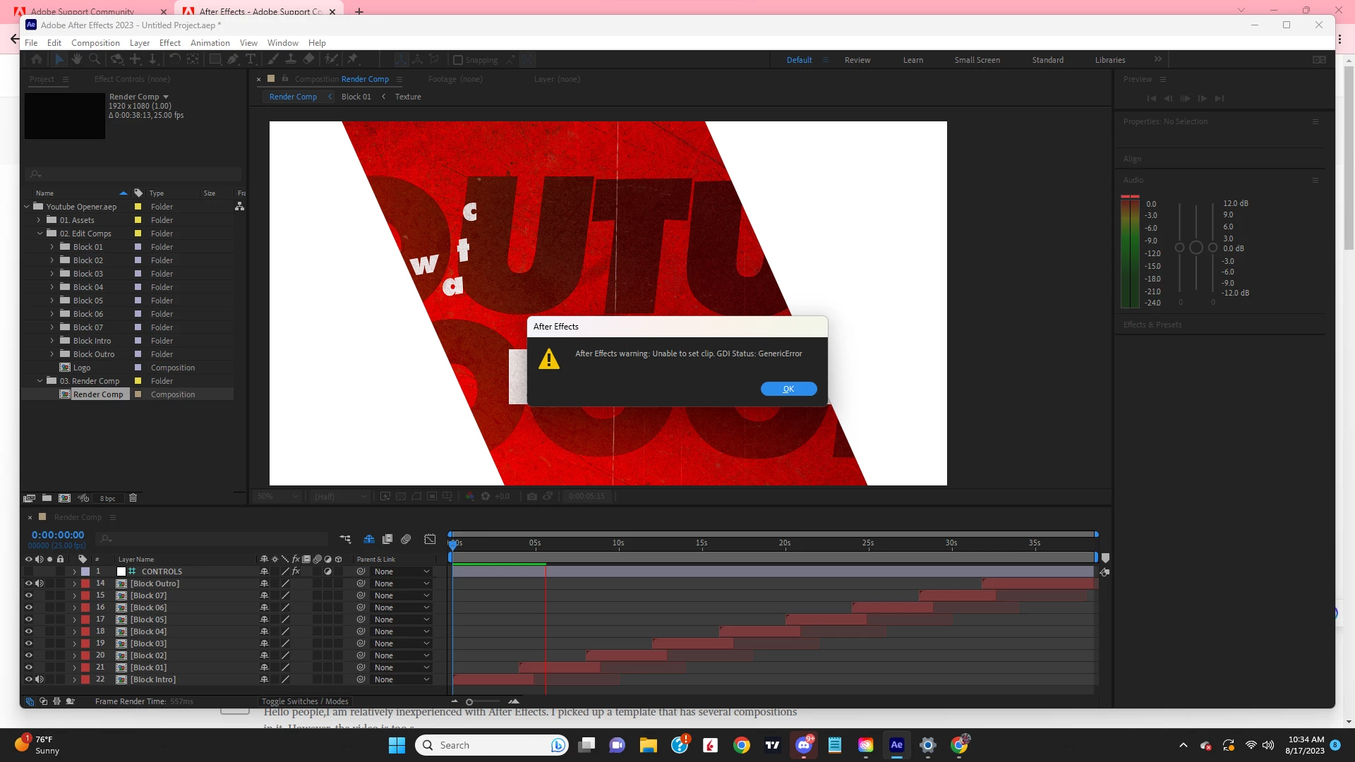 After effects warning: unable to set clip