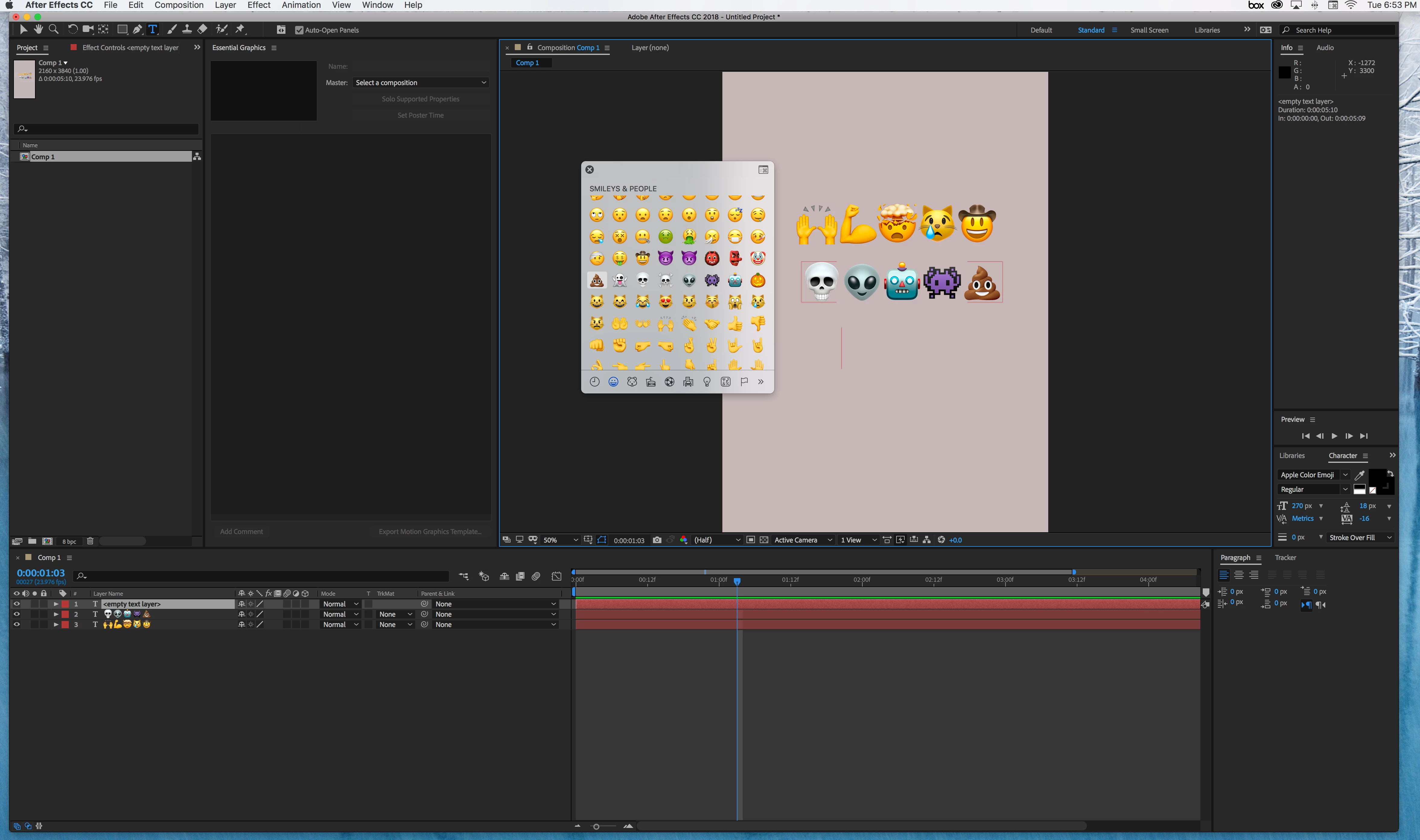 In After Effects 2018 (version 15.1.2) I was able to use the Apple Color Emoji font directly inside AE. My process was to create a line of text, change the font to Apple Color Emoji, then pull up the Emoji font keyboard and double click on the emojis I wanted to put in the line of text. In After Effects 2019 (version 16.0.1), I can't get the emojis to appear in the line of text after I double click on them. However, in the composition panel, you can see the emojis in the source name of the text layer...