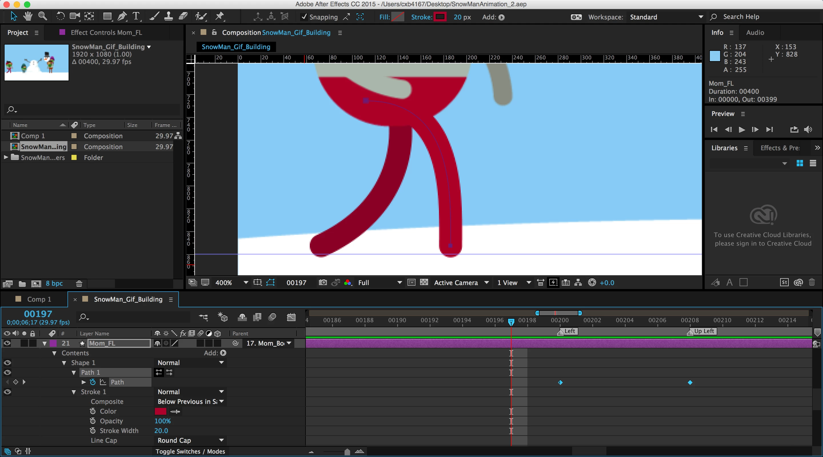 I am working on a simple walking animation using 16 frames. I am just using two strokes for legs that I used to the pen tool to create.