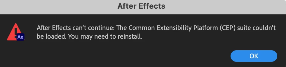 When I open up After Effects, it keeps having a pop-up that says "The Common Extensibility Platform (CEP) suite couldn't be loaded. You may have to re-install." No un-installing and re-installing could fix the problem. I am on a Macbook. What could I do to fix it?