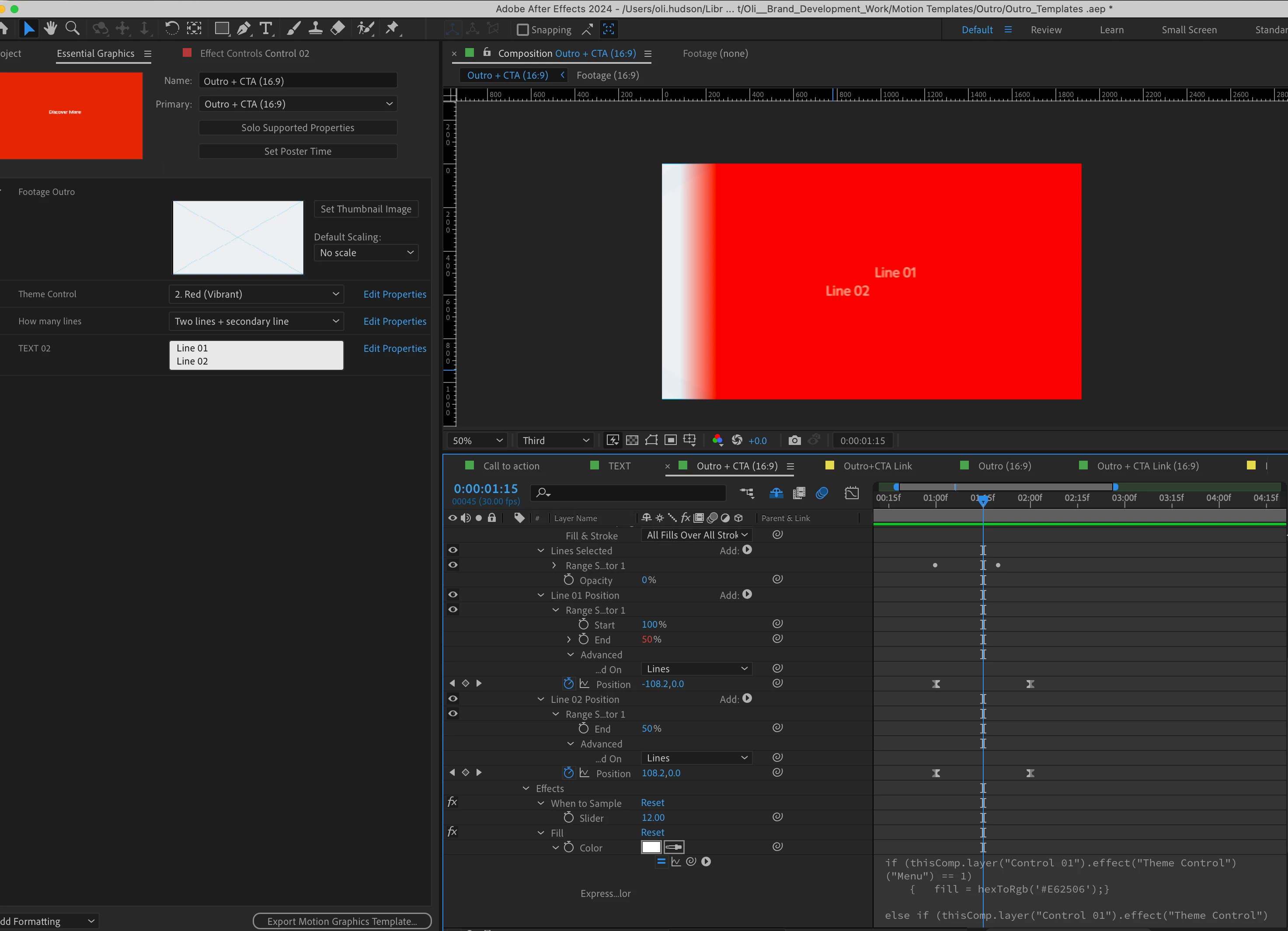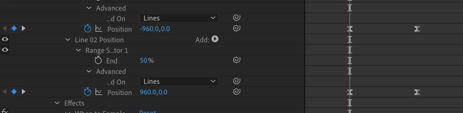 I have animated two lines of type for a template where they animate from opposite starting positions and then come together. The drop down in the template allows one line of type, two lines and a third option where both lines have the same starting position.