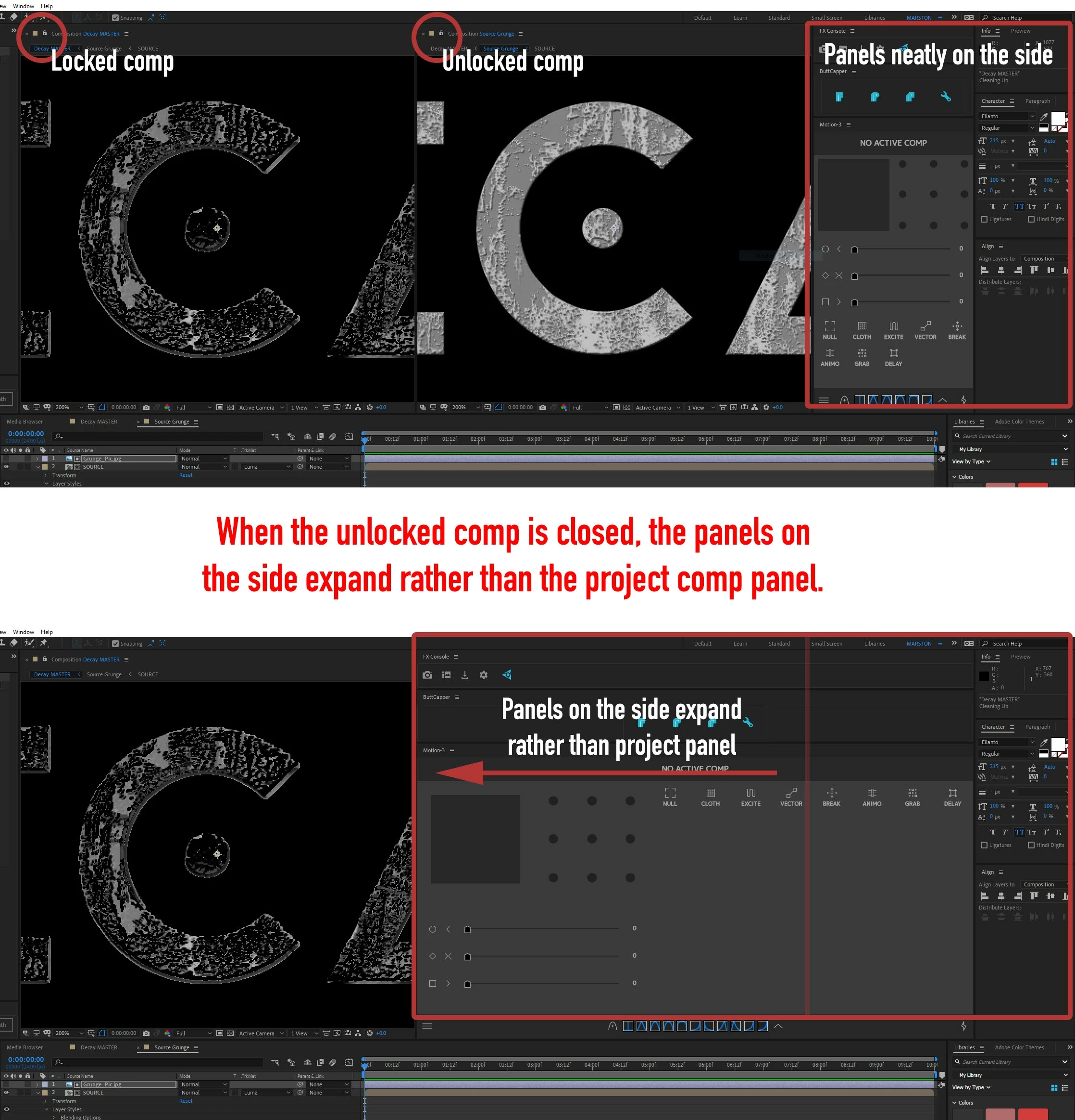 Every time I close a second project panel, it resizes the size panels rather than the main locked project panel where I'm viewing the main comp. This causes me to have to drag and resize the size panels. Does anyone know how to force the side panels to stay the same size and the main comp project panel to expand and fit the space? Thanks much!