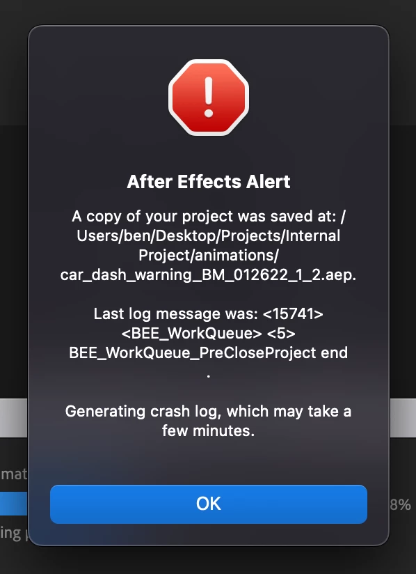 I cannot open or import a recent project (or any of it's autosaves) without AE crashing and giving me this notification.