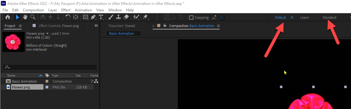 The only difference is that Default has all the panels stacked and in the Standard workspace you have individual panels for every window. Also in the Standard panel you don't have open all the panels (tracker, content aware fil, etc)