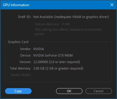 What might be the issue here? My MSI Laptop, equipped with an i7 6700HQ processor running at a boosted 3.2GHz, and a GTX 960M 2GB graphics card, seems to meet the system requirements. Despite this alignment, I'm unable to utilize the draft 3D feature.
