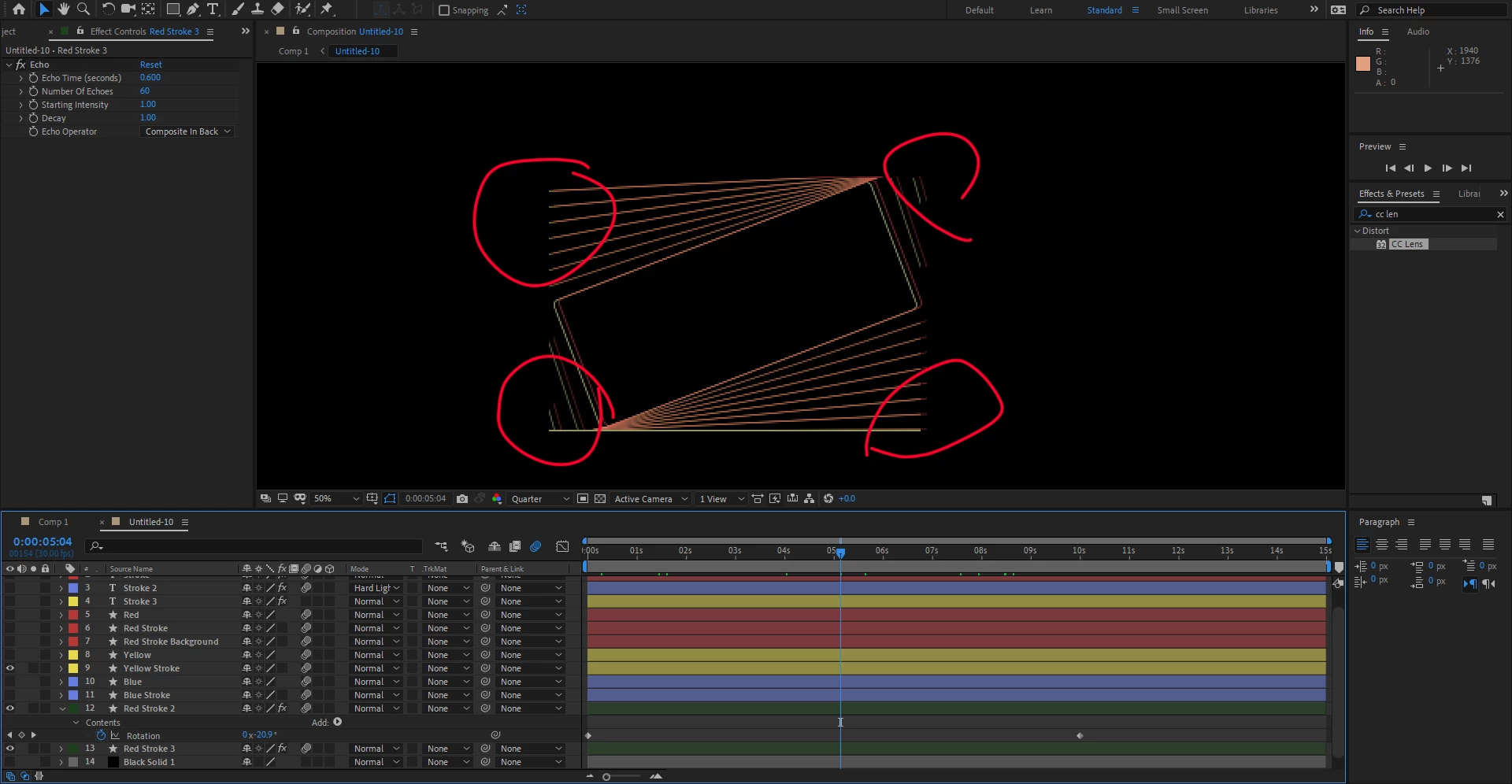 You are showing us the echo settings for layer Red Stroke 3 and the keyframes for layer Red Stroke 2. We have no way of knowing what is going on with Red Stroke 2 or even if that layer is the problem. Solo the layer you are having problems with, select that layer, and press 'uu' so we can see exactly what is happening with that layer and we can probably help you figure out what is going on.  Unfortunately, your screenshots don't tell us anything useful.