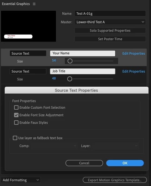 I hope this isn't a newbie oversight, but I created a simple lower third in After Effects and exported an mogrt allowing source text editing and font size adjustment. When I use this mogrt in Premiere Pro, the font sizes for both text layers default to 1 pixel (which is, for all practical purposes, invisible). Should these assume the size at which they were exported? If not, is there a way to set a default?