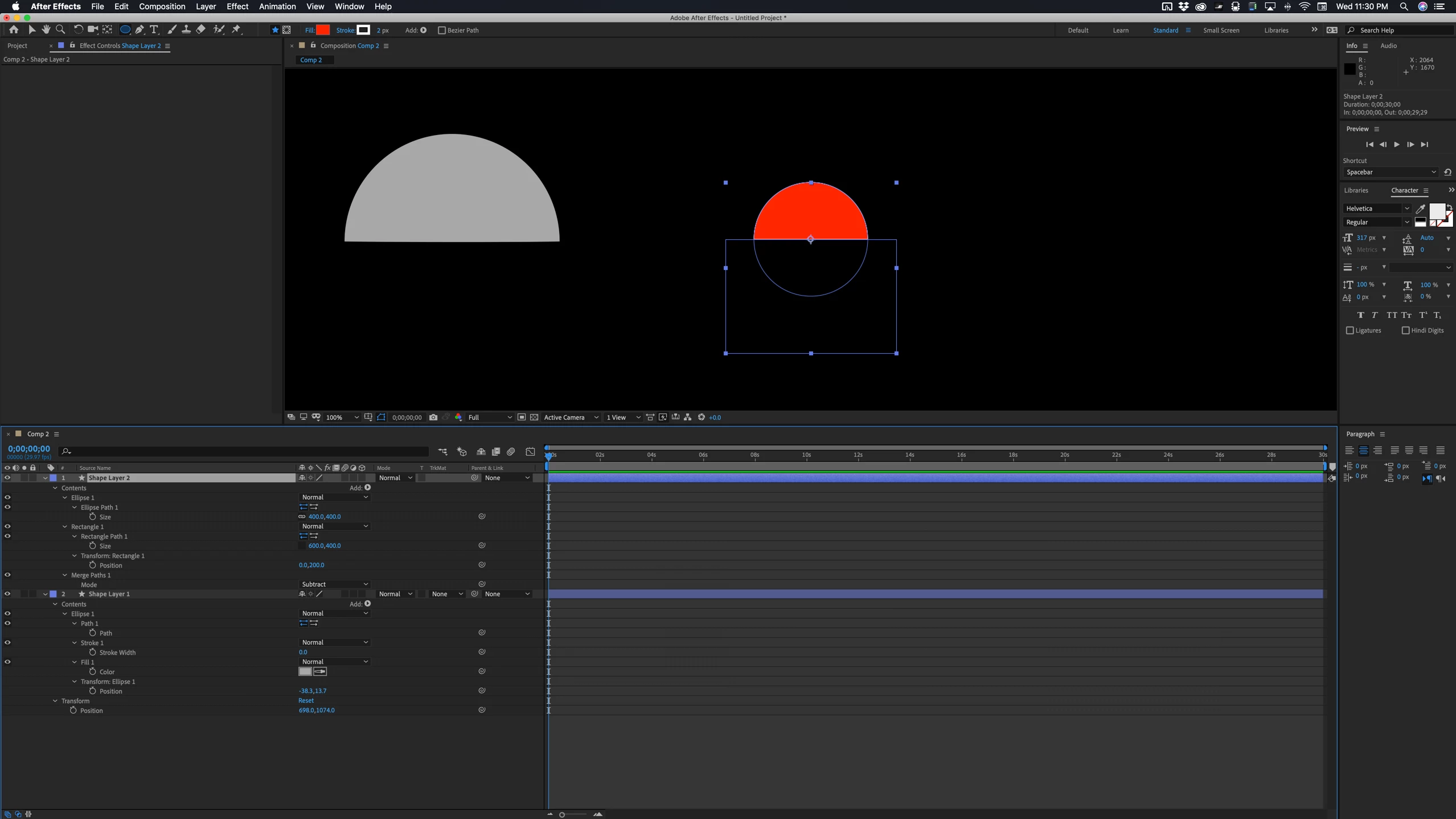 - Reset both the Transform Rectangle1>position and Transform Ellipse1>Position to 0, 0 and they should end up in the center of the comp and be aligned with each other