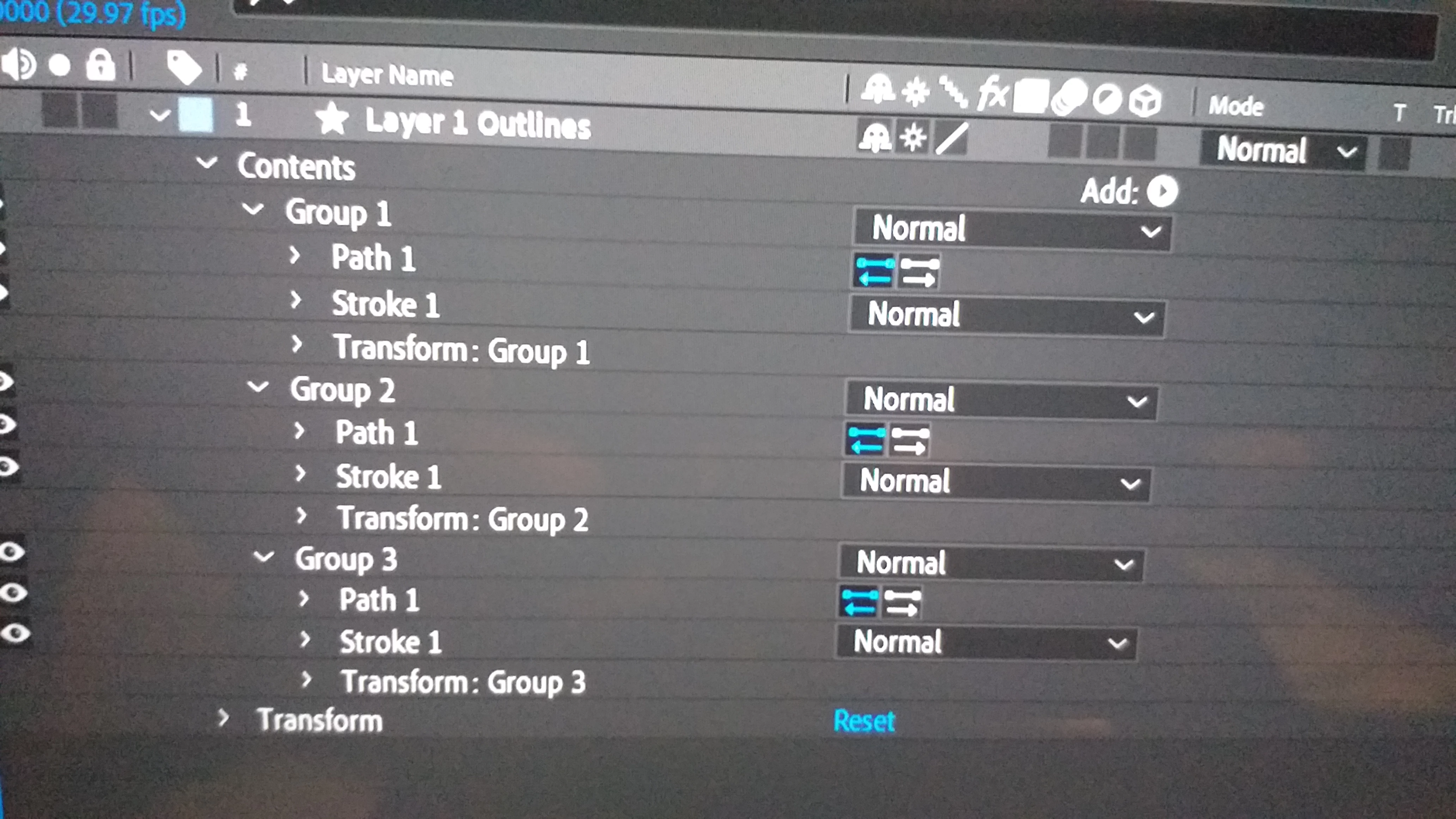 I don't have any idea what you mean when you talk about the Slider in the timeline reaching dots A and B. The A and B circles are around keyframes for path position. It looks like they are about 3 frames apart. I don't see a slider, but you can animate opacity over 3 frames to hide Group 3 Path 1. Spin down all the properties in Group 3 and you should find opacity.