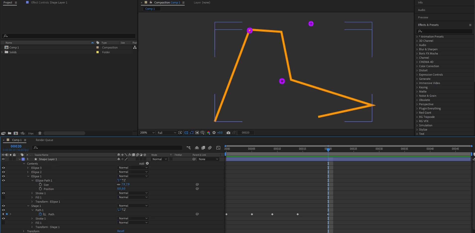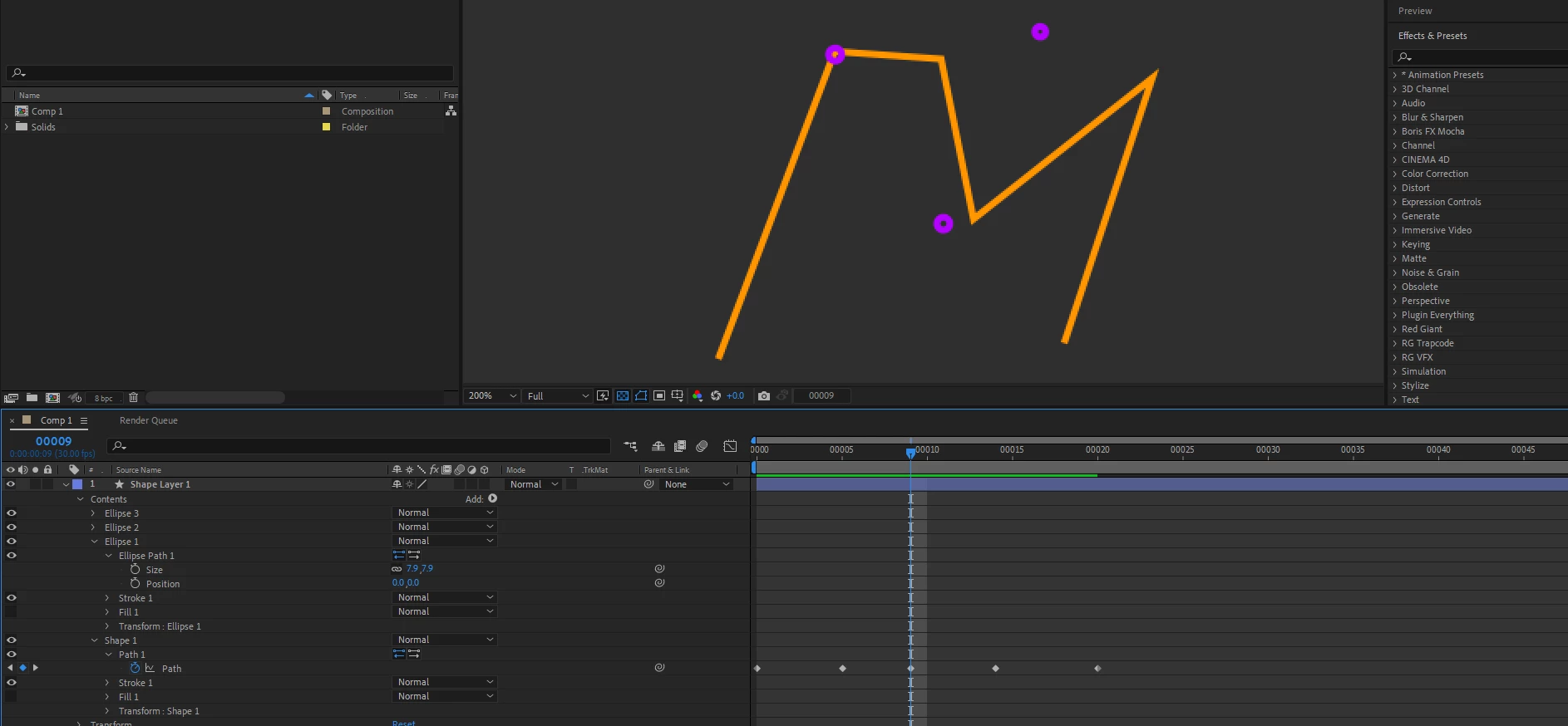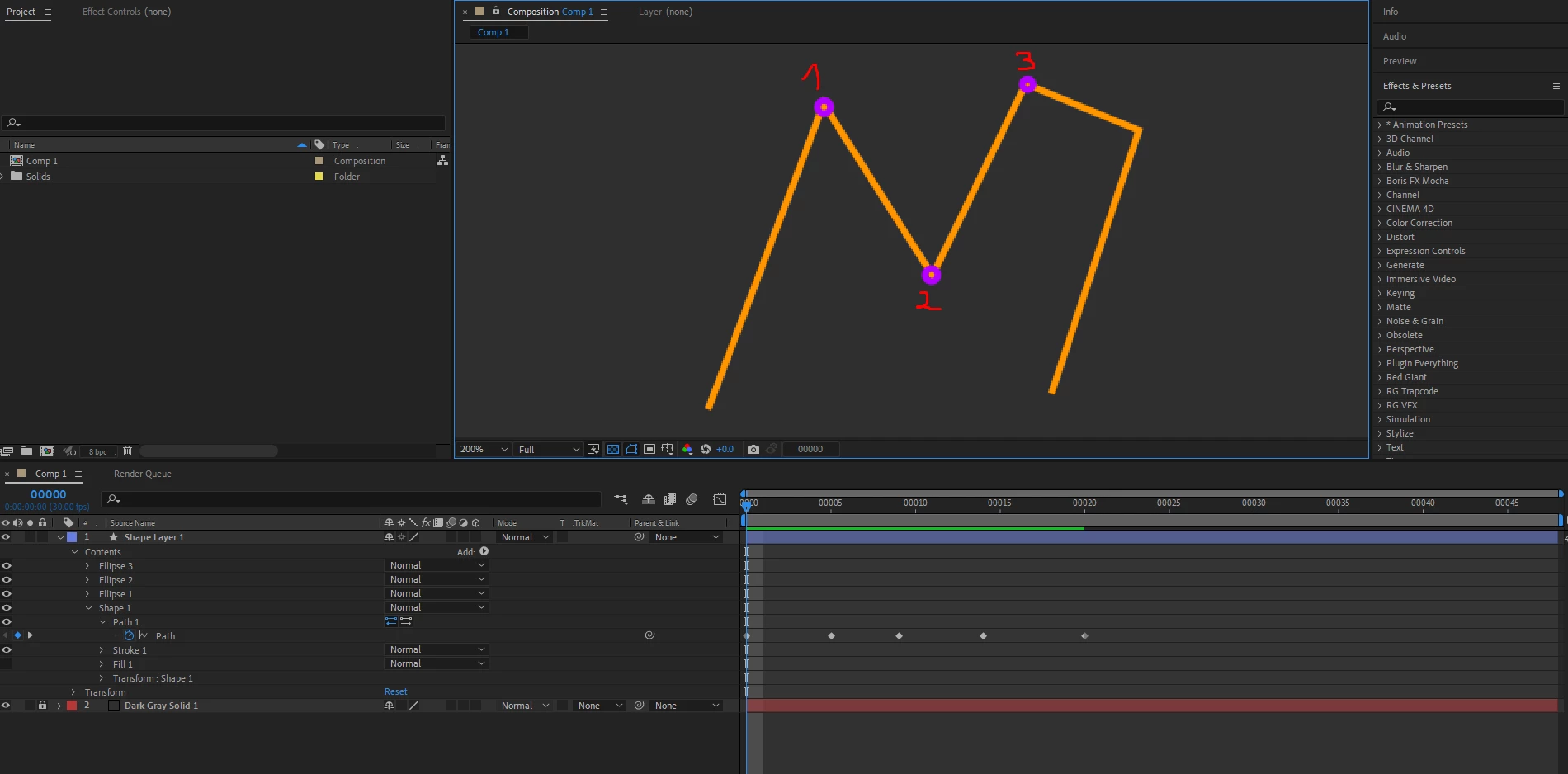 Is it possible to make these circles 1,2,3 follow the corners of these lines, where ever I position them on the canvas, they follow allong? My initial thought was draw the line animation, where the line changes shape, making zig zags and random wave shapes, and then add in the same shape 3 circle shapes, and I thought of using the pick whip to connect their position, but didnt work.
