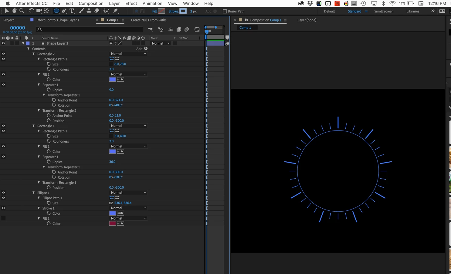 I moved the timeline to the left and revealed all modified properties of the shape layer by pressing the U key twice so you could duplicate it. Started with an ellipse, added a rounded rectangle and a repeater, adjusted the Rectangle 1 position and the Repeater 1 number of copies, anchor point, and rotation, duplicated Rectangle 1 and changed a couple of the numbers. It took about two minutes. and all of the values are nothing more than simple math. The really cool thing is that you can animate those properties and make the graphic do all kinds of great things with just a couple of keyframes.