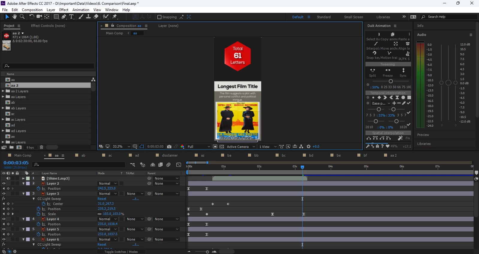 In the first image, you can see a composition with 10 layers, each containing various effects and keyframes.