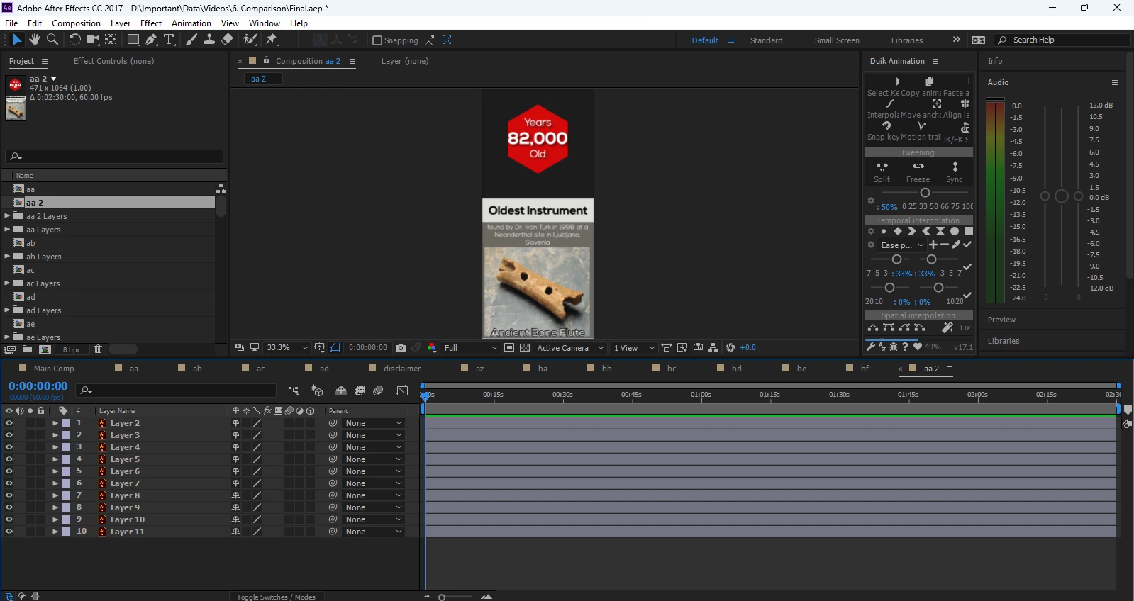 In the second image, there is another composition with the same 10 layers, but without the effects and keyframes. The layers have some minor changes compared to the first image, except for the missing effects and keyframes.