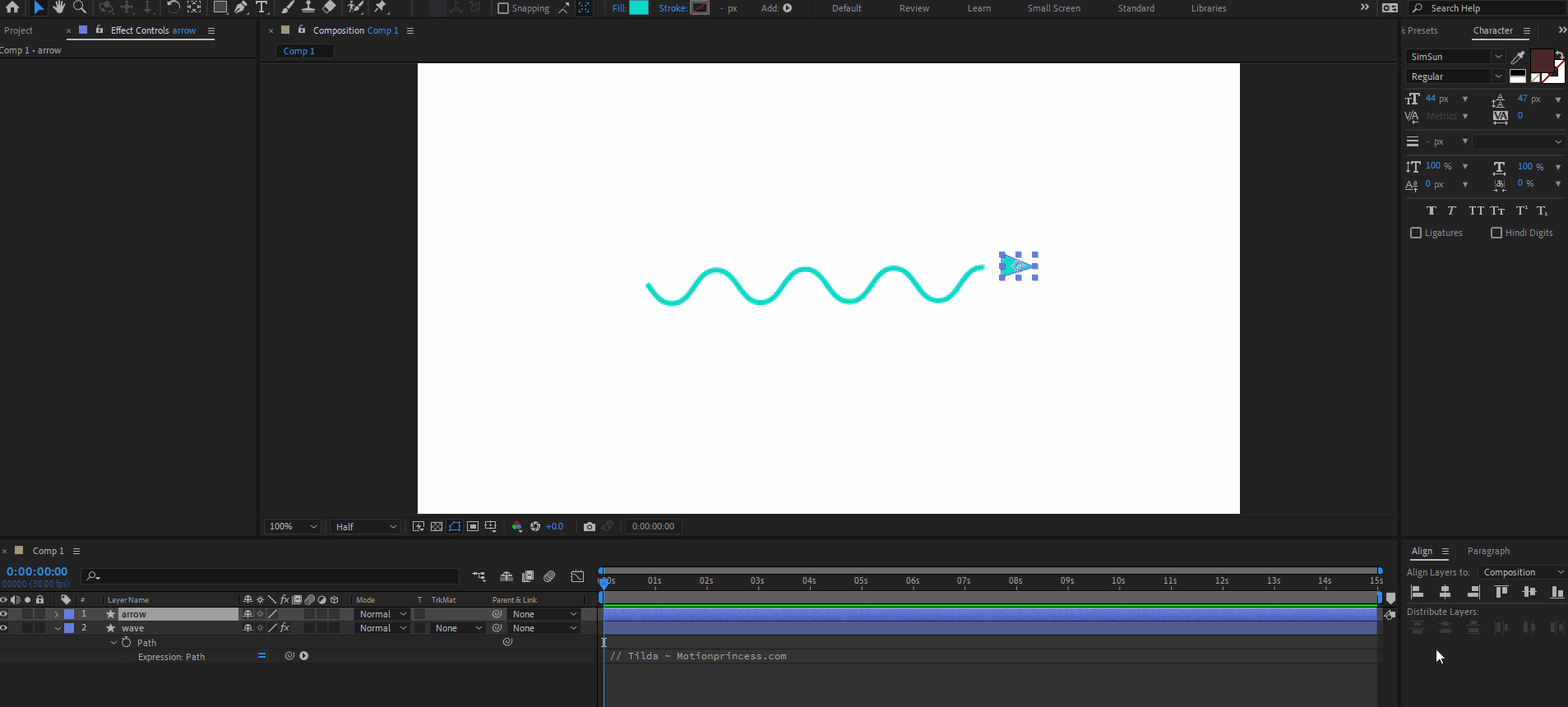 I want to create a wavy arrow. I created one wave using a script. I wanted to attach the arrowhead at the endpoint of the wave by parenting, but that didn't work. The arrowhead could not sync with the rhythm of the wave, it gets dislodged. I came to know I have to attach the arrowhead using some special math. Sin expression. But no way I could find one on google that can show/teach me how to attach something at the endpoint of a wave using math. sin expression! There are other examples of this expression but those didn't serve my purpose.