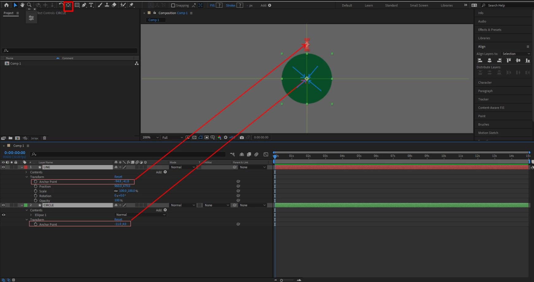 Im following a tutorial on YT about the anchor point positioning. It works as expected, but is there also an alternative to match the anchor points without the pan tool? I try to copy paste the anchor point settings of the circle values, into the line anchor point values, but the line shape jumps out of position. Or if I change the values of either the anchor points, circle or line, the shapes move, instead of the anchor point.
