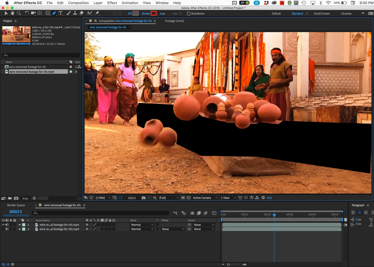 The big black mask is pretty easy to create using the pen tool because the camera does not move. When the pots start falling off the table you'll have to do some hand rotoscoping to keep them visible. The rotoscope is where the first part of the hard work begins. Every pot will require some hand masking as they fall through the big black hole to keep them visible. Automatic tools like Rotobrush will not work well because there are few contrasting colors so this will all be roto by hand.