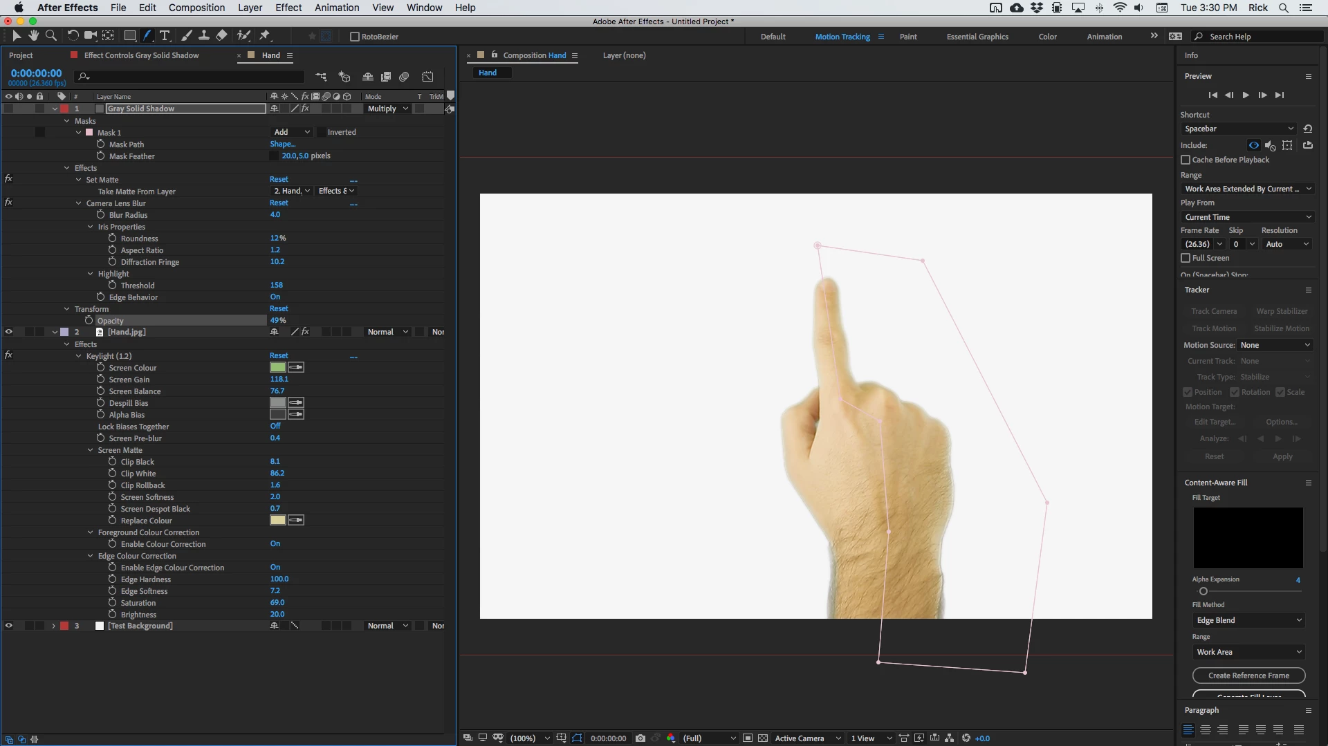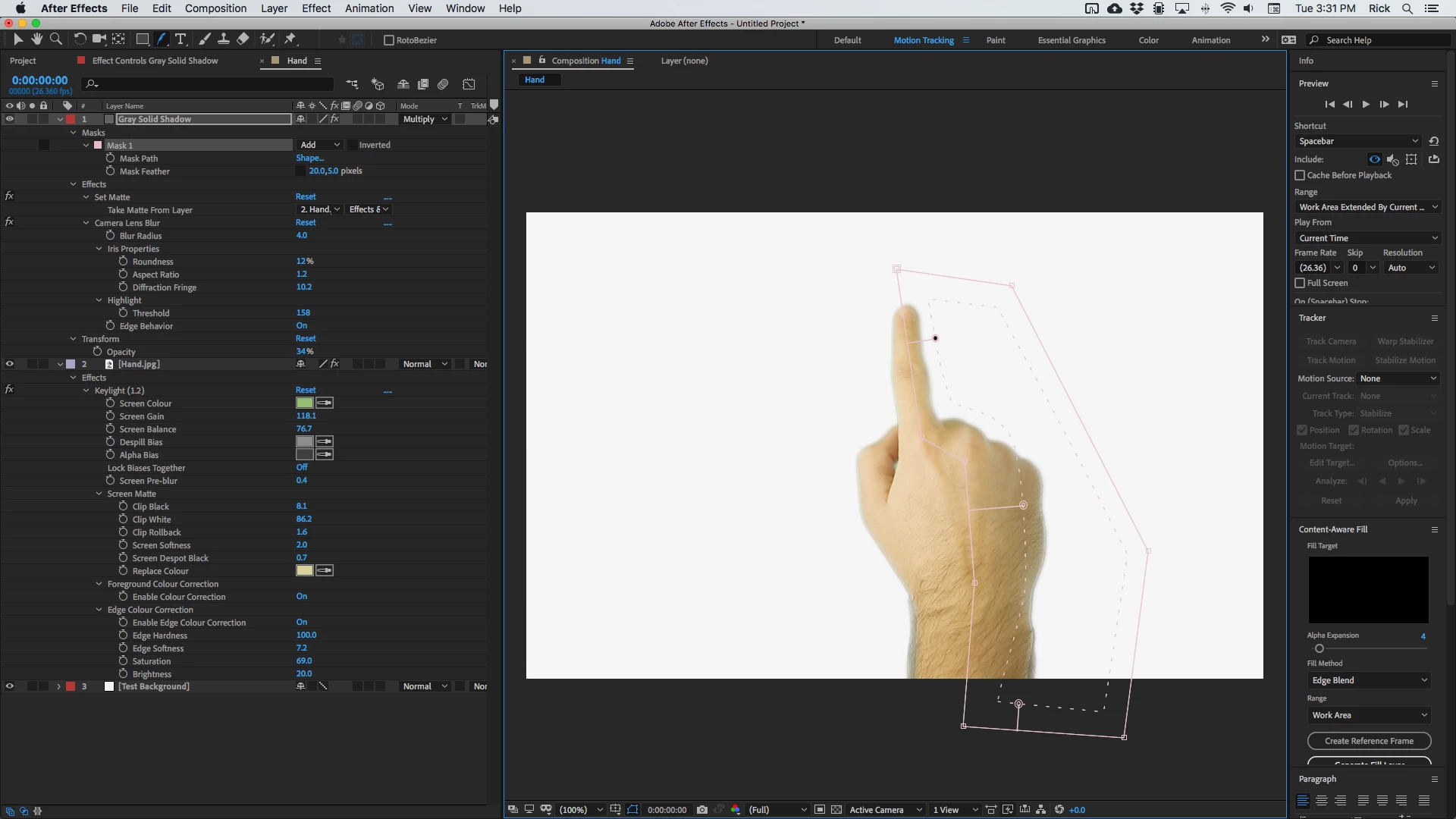 The edges are clean, there is no edge contamination, the hair on the actor's arm shows through the background. Yes there still is a bright edge on the right side of the hand, but that is because there is a light source on the right side of the hand and that contradicts the shadow on your background image. The fix for that is to fake the shadow. You'll have to animate the mask, but this improves it a bit. The shadow layer is now turned on.