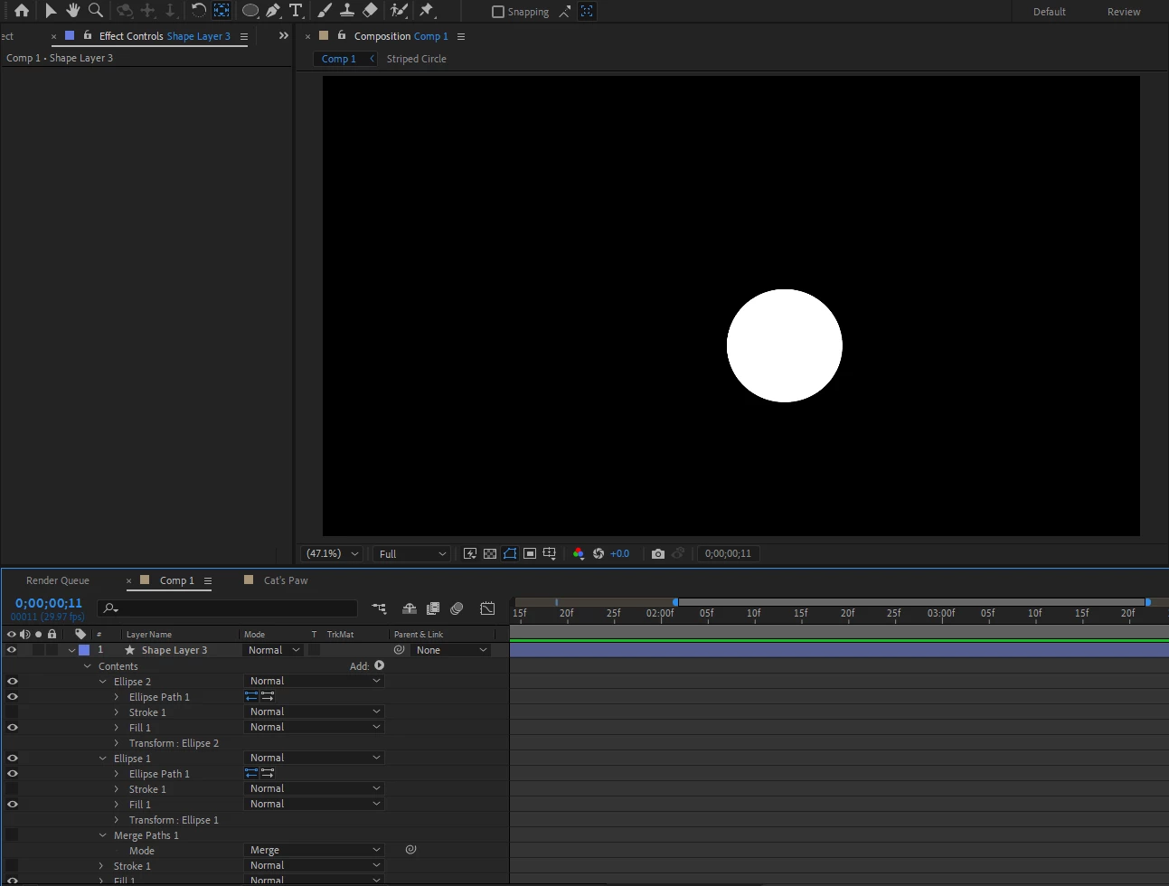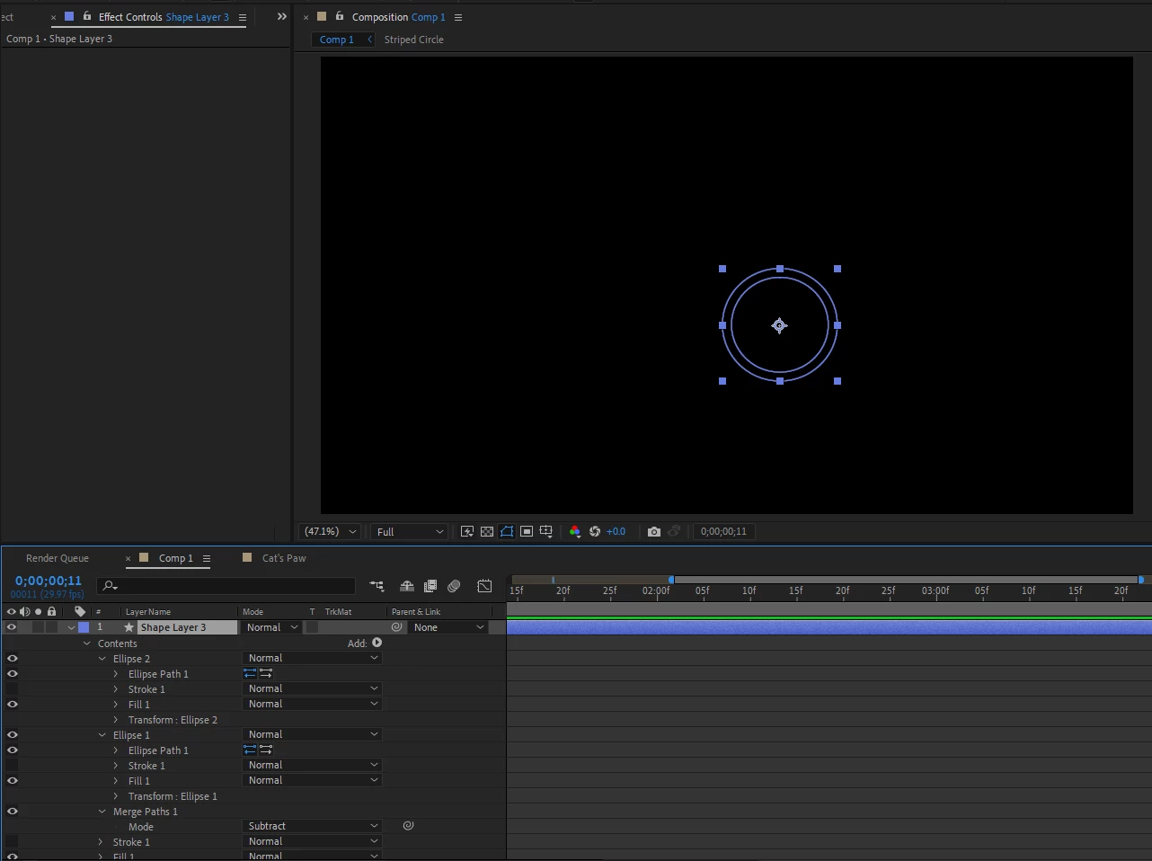 I'm attempting to follow this tutorial for the "Circle Splode" section starting at 4:54. I've created two elipses that have their scale keyframed to increase from 0 -> 100 with "Elipse 2" set to occur slightly later than "Elipse 1". According to the tutorial, I should add a merge paths to below the two elipsis and above the stroke/ fill (the stroke is disabled) and set the merge paths to "Subtract". Doing so however causes my shapes to completely dissapear.