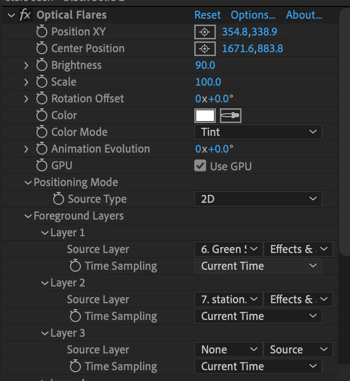 If the effect never does reappear, select the Optical Flares layer, press the U key twice to reveal all modified properties in the Optical Flares section of the timeline, and start at the bottom resetting the modified properties.