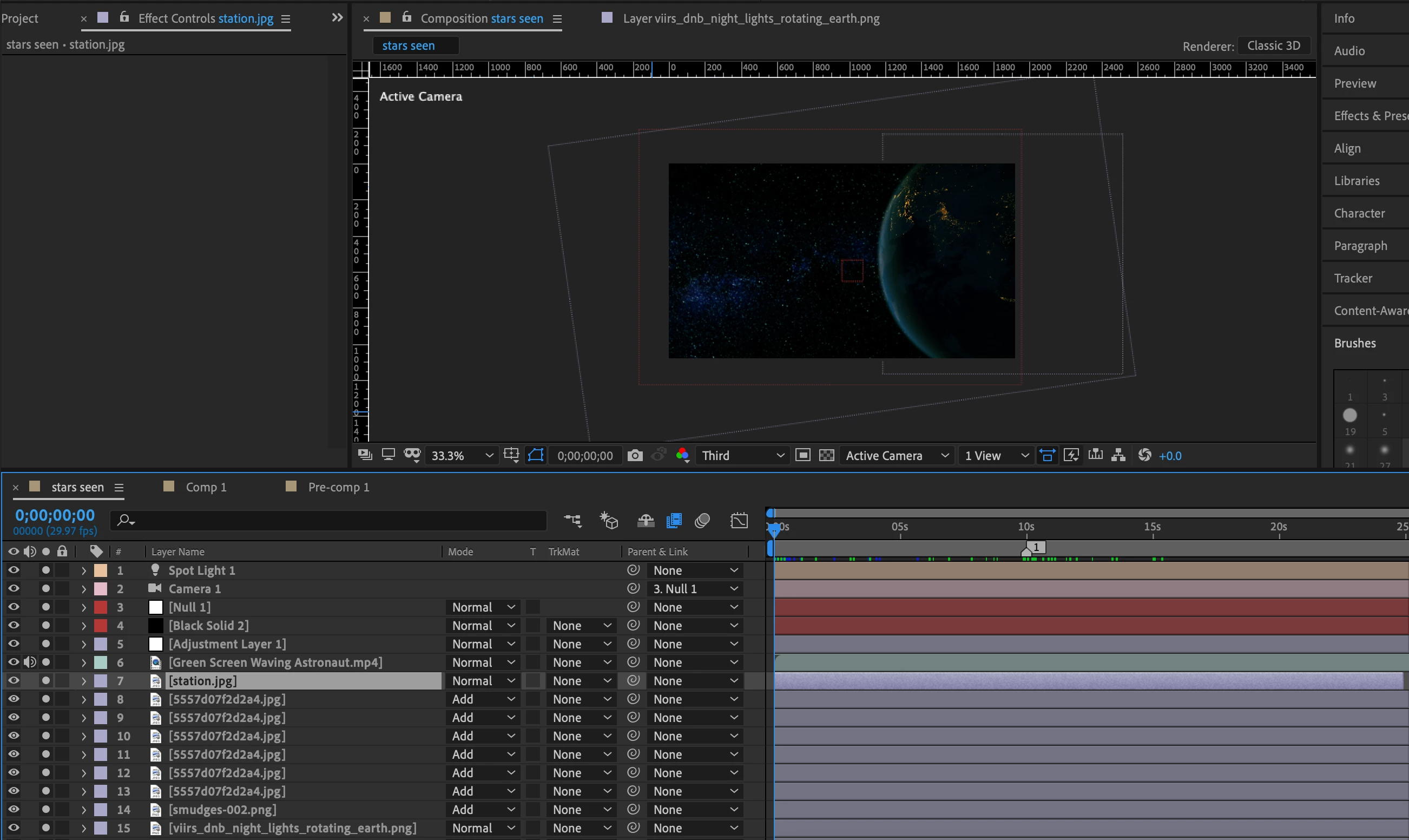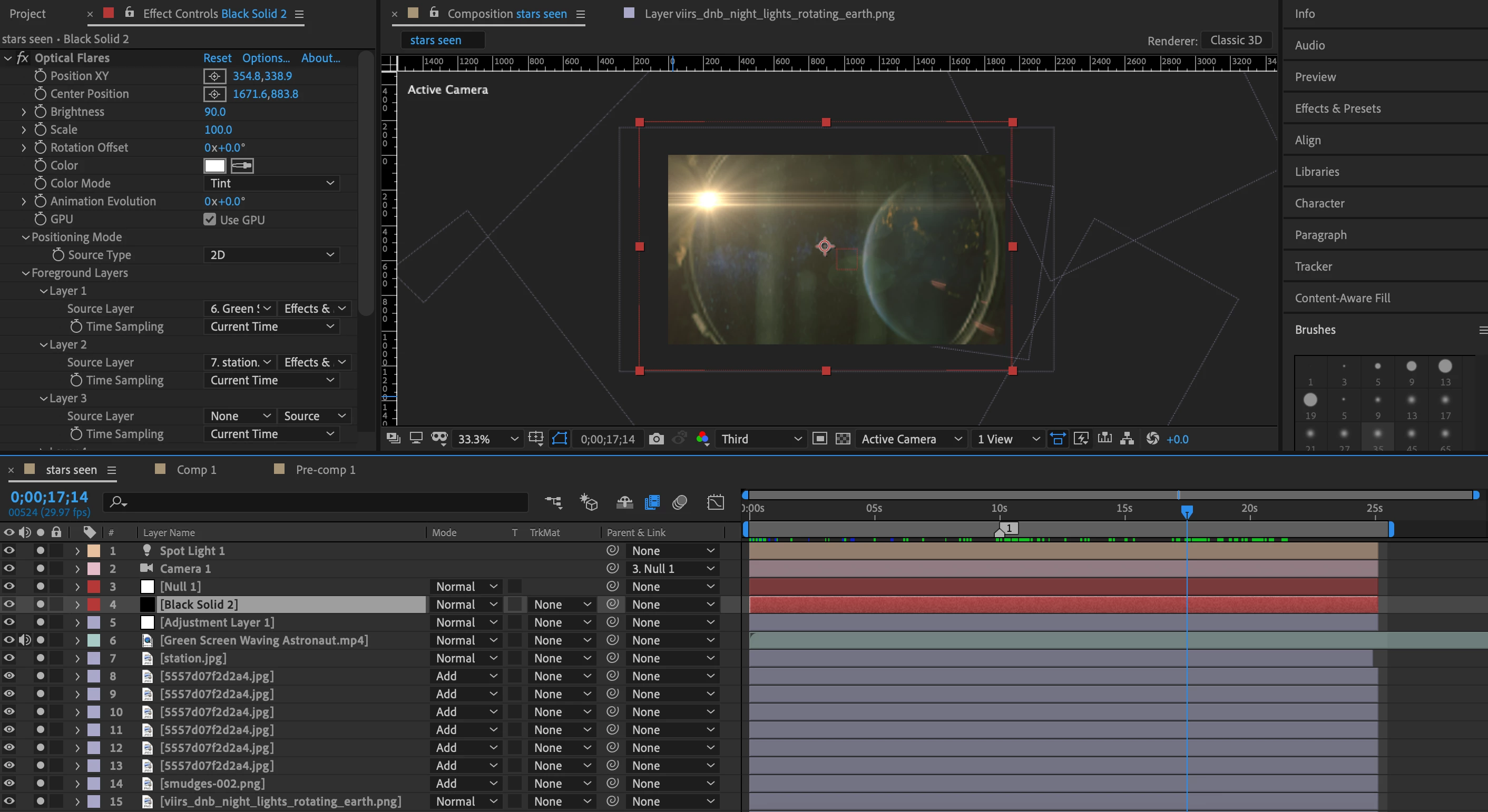 I tried to pre-compose but I lose the foreground type: effect and mask of the space station. So how I can keep my optical flares working all the way in the composition with the desired effects on other objects?