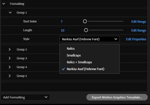 I have a template for a lower third graphic, and I want to be able to select specific sections of text by using sliders, and then apply preset custom formatting to that text by using a dropdown menu which lists four possible formatting options. Here's what the Essential Graphics setup looks like:
