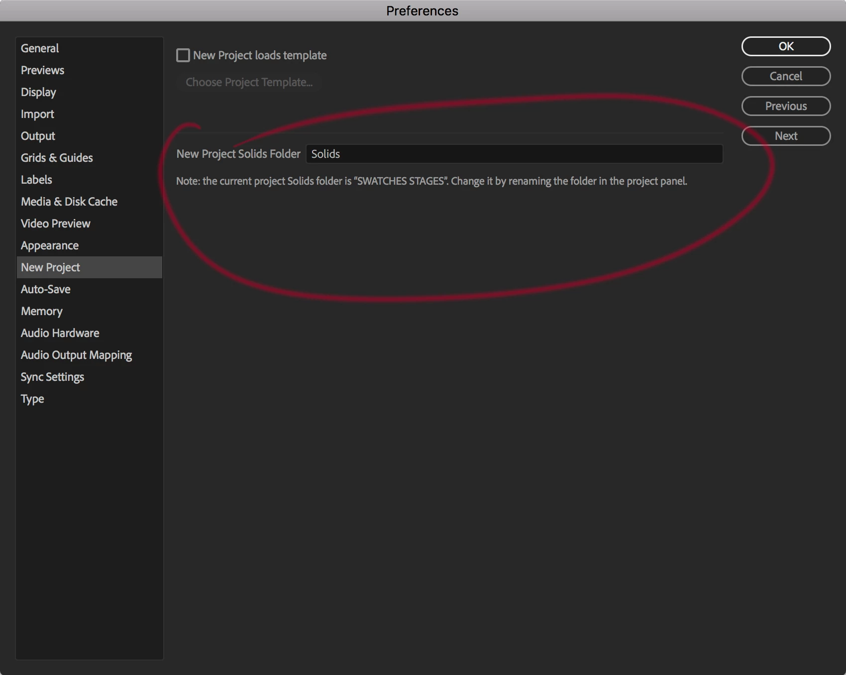 A while ago I renamed the Solids folder in a project to SWATCHES. Since then, whenever I create a Solid Layer, Adjustment Layer etc. they get placed into a folder called SWATCHES… Somehow, I've changed the default folder name and I can't find where to change it back…