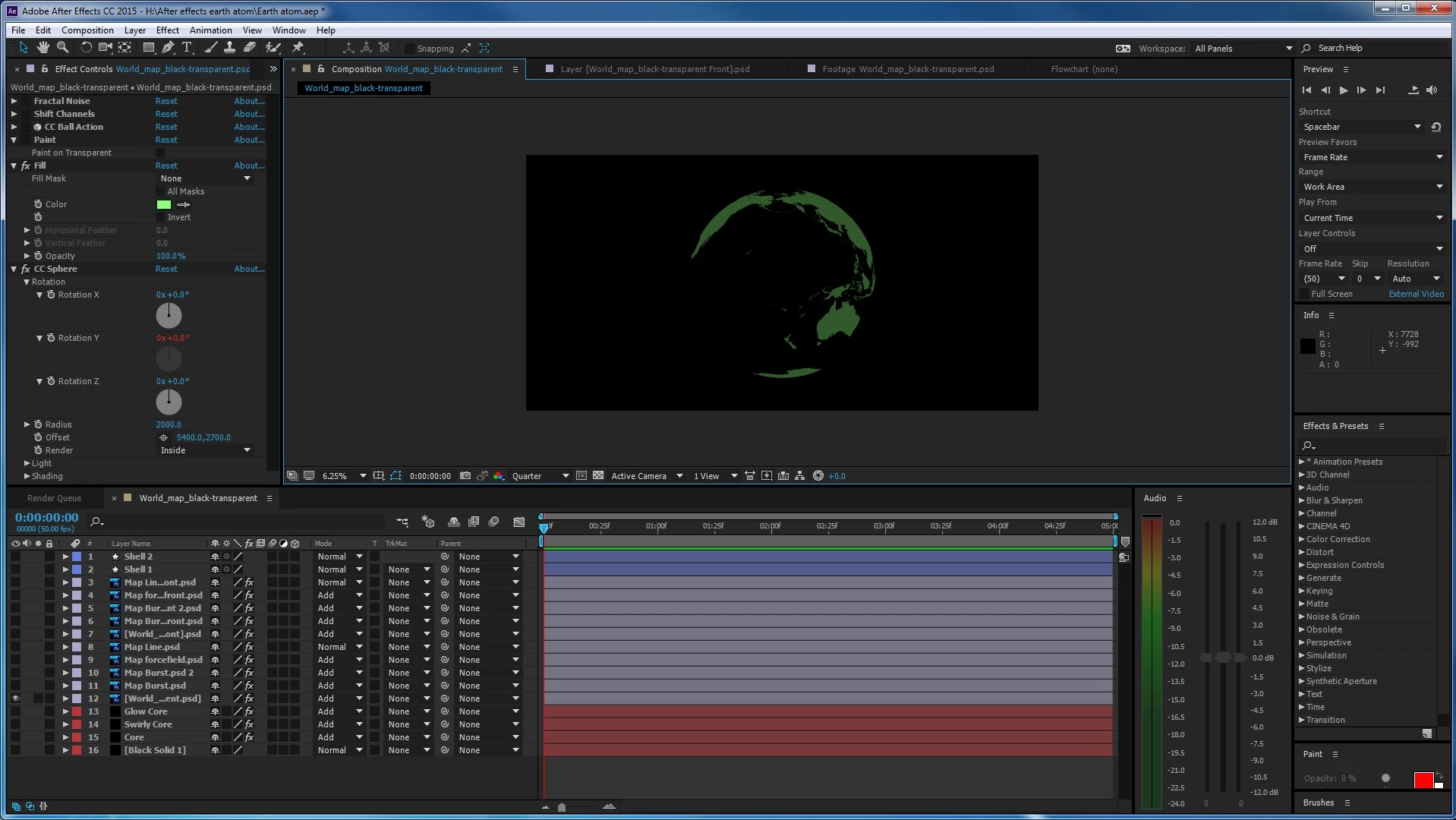 The image originated in photoshop and was imported as footage. Most of the image is transparent and is on a CC sphere effect as you can see on the attached screenshot (I turned the transparency grid off to make the globe more visible, everything black is transparent, the layer I am working on is the globe). What I want is the edge of the globe at 100% opacity and the centre at 0% without interfering with the transparent background with solids or masks. I'd also like this effect to apply to several layers (8 through 12).