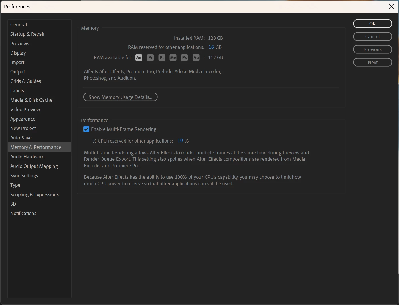 Here's what I have my memory preferences set to, it's what AE defaults to: